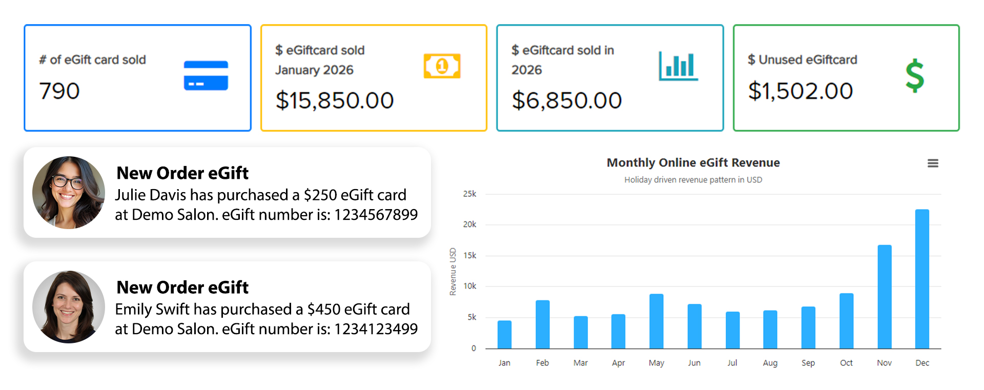 Thúc đẩy dòng tiền ổn định bằng cách bán eGift trực tuyến. Khách hàng thanh toán trước, giúp salon thu tiền sớm hơn, đồng thời khuyến khích quay lại thường xuyên và gia tăng giá trị khách hàng lâu dài.